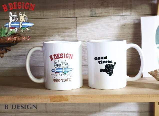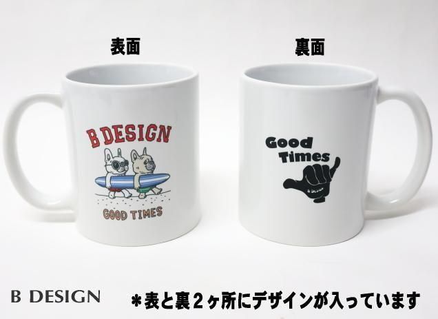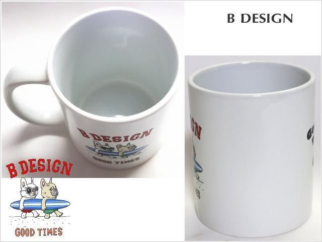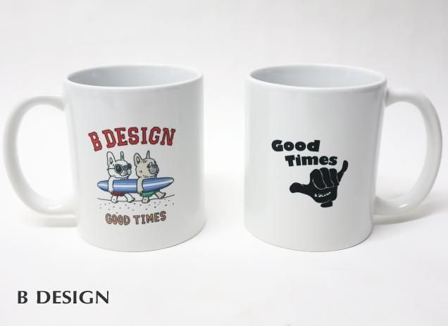 フレブルの絵描きとして有名な「きよし(kiyoc)」さんとのコラボデザインの「SURF BUHI」が片面に、反対側にもB DESIGNオリジナルデザインが入った、2デザイン入りのマグカップです。